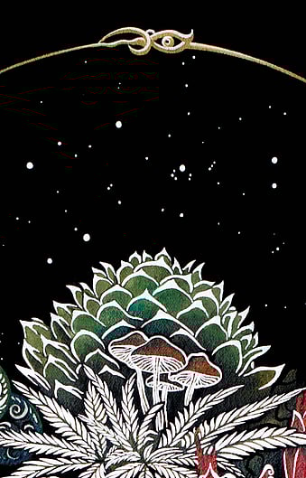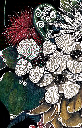 Intricate Māori motifs in white dance over ponga (fern) leaves and unfolding koru fronds; a kauri pine cone; mushrooms; cannabis and kawakawa leaves; harakeke, pohutukawa, mānuka and kōwhai flowers; and red karamu and miro berries.