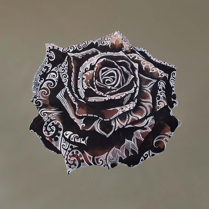 "Midnight Rose" illustrates Te Pō (the night) transitioning into Te Ao Mārama (world of light). It represents healing, renewal, and growth, visually guiding viewers from darkness towards clarity and hope.