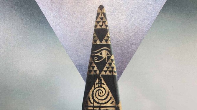 "The Navigators" honours ancestral voyagers. The painting features a crown chakra-inspired formation, with koru patterns symbolising eternal growth, guided by the stars of Matariki illuminating the spiritual journey.