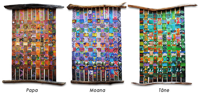 Entitled Papa, Moana and Tane, the artworks consist of individual strips of canvas painted by the children that I have woven and framed with driftwood from Ohope Beach.