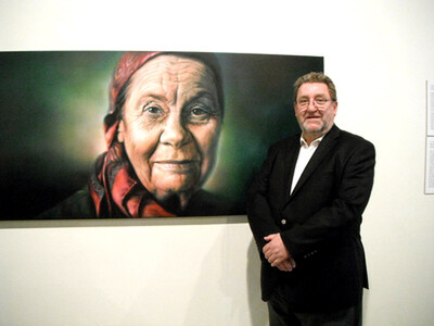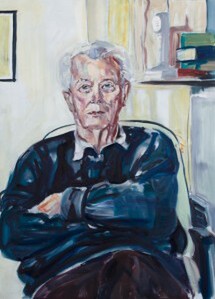 Curator Brian Easton with Minson's painting "Dame Joan Metge"