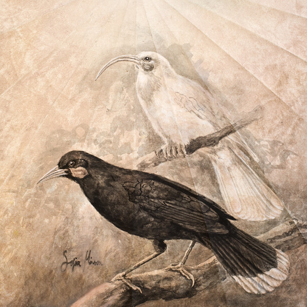 Most Huia had black plumage with a green metallic tinge and distinctive rounded bright orange wattles at the gape. This artwork by Minson, adapted from a painting by J.G. Keulemanssome, depicts a male and also a very rare albinistic female.