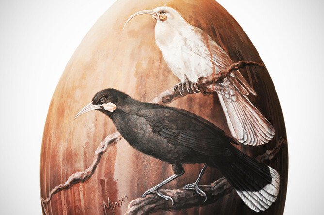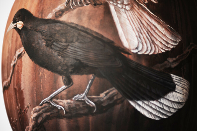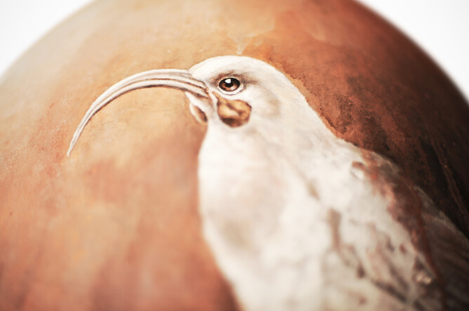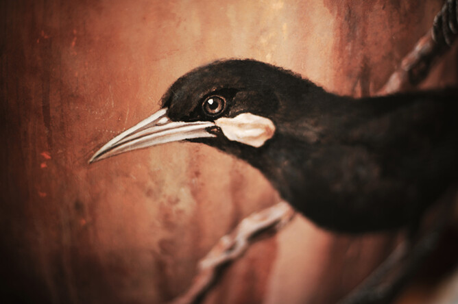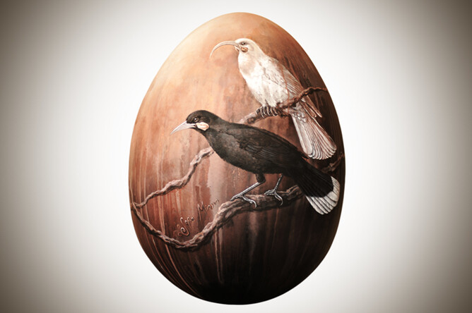Minson's artwork "Huia" depicts a male and also a very rare albinistic female of the now extinct native New Zealand bird. In traditional M?ori life the huia’s white-tipped black feathers were worn by people of high rank and were kept in a special carved box called a waka huia. The huia reminds us of Aotearoa's unique ancient past - a land densely covered in native forest, full of endemic birds without predators. Although we can't go back to that, Sofia hopes that at Easter time, this time of new beginnings, the huia will inspire us to embrace our role as 'kaitiaki' or 'guardians' of the mauri (vital life force) of all entities animate and inanimate within the whakapapa (genealogy) of the natural world.