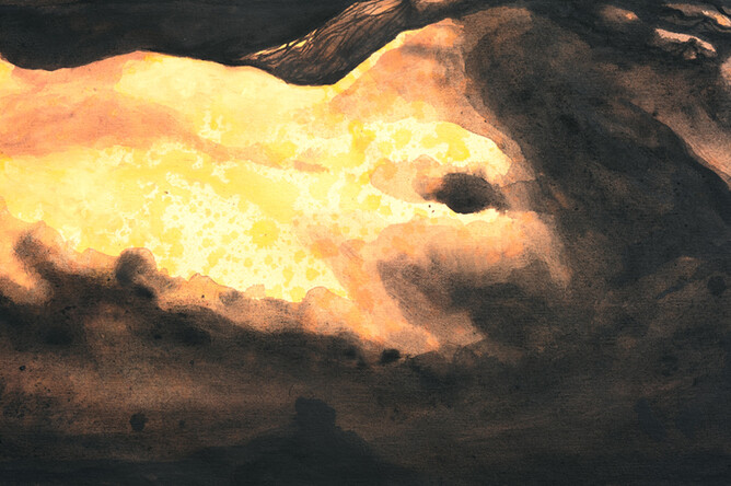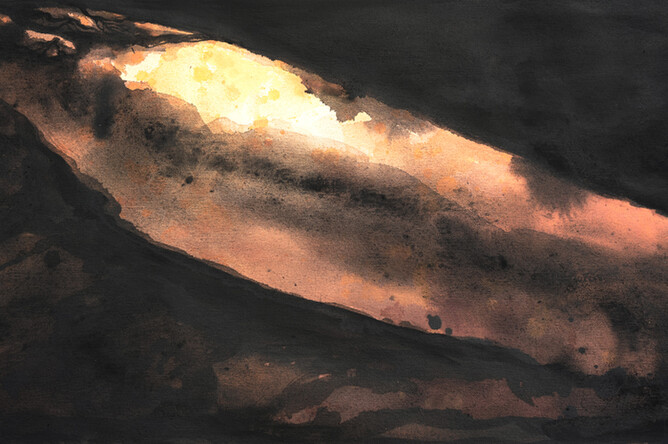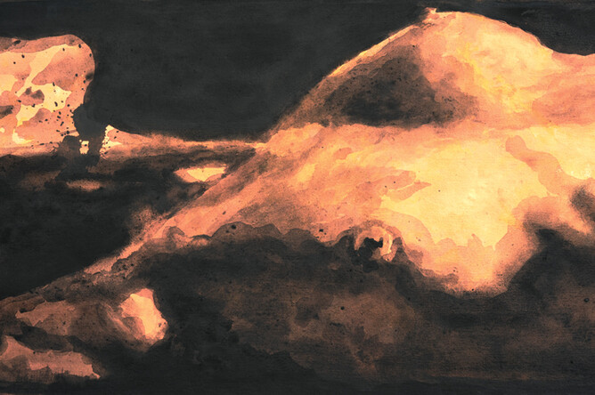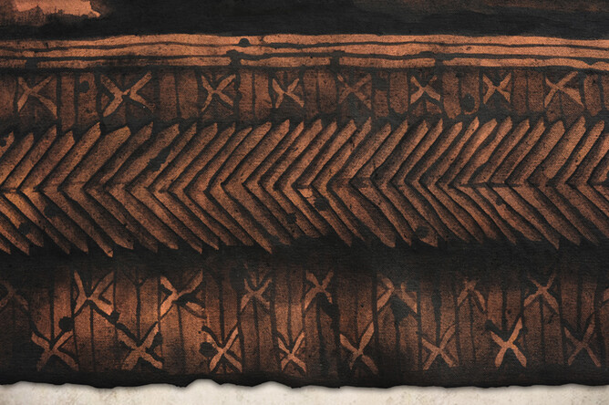Sofia Minson's painting "First Mother" is Papatuanuku, the earth mother from Maori creationary mythology. Her curves are that of the landscape and she is surrounded above and below by Tukutuku patterns, which are traditional woven flax panels in marae (meeting houses). The appearance of this work is influenced by Pacific Tapa cloths and Minson has used an ink-like paint to create the wash effect.