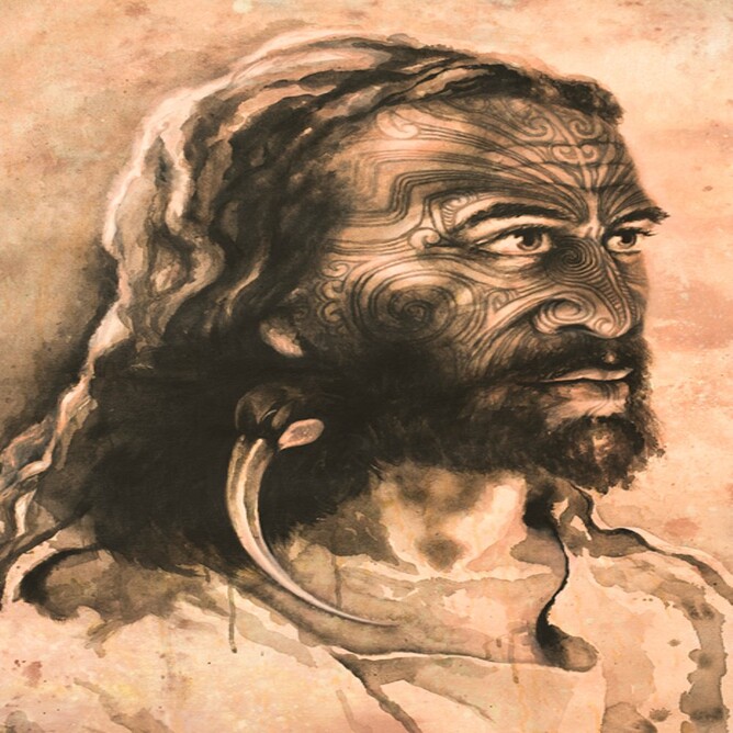 Close-up of 'Tukukino' by Gottfried Lindauer, oil on canvas, 1878. Minson has painted 'Maori Jesus' with an extinct native huia bird tucked into his neck, in the vein of C.F. Goldie and Gottfried Lindauer’s 19th century portraits of Maori.
