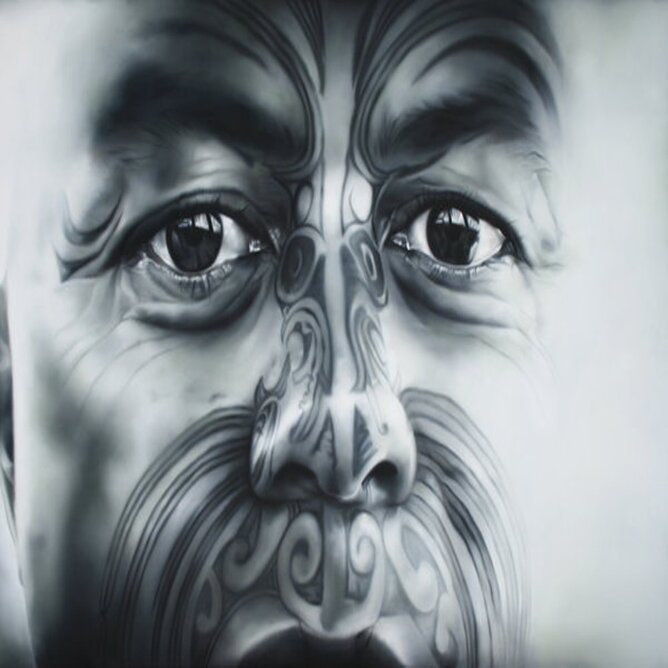 “Maori Jesus” is Sofia Minson's depiction of the Messiah as tangata whenua (indigenous Maori) with full-face moko (traditional tattoo). A celebration and revival of Maori portrait painting.