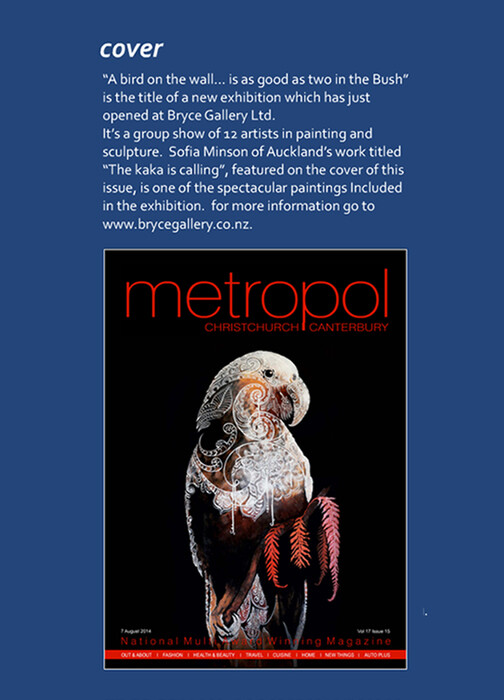 "A bird on the wall...is as good as two in the bush" is the title of a new exhibition which has just opened at Bryce Gallery Ltd. It's a group show of 12 artists in painting and sculpture. Sofia Minson of Auckland's work titled "The Kaka is Calling", featured on the cover of this issue, is one of the spectacular paintings included in the exhibition. For more information go to www.brycegallery.co.nz.