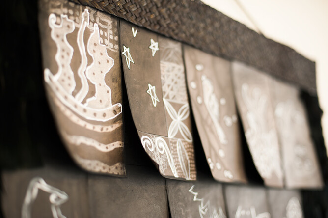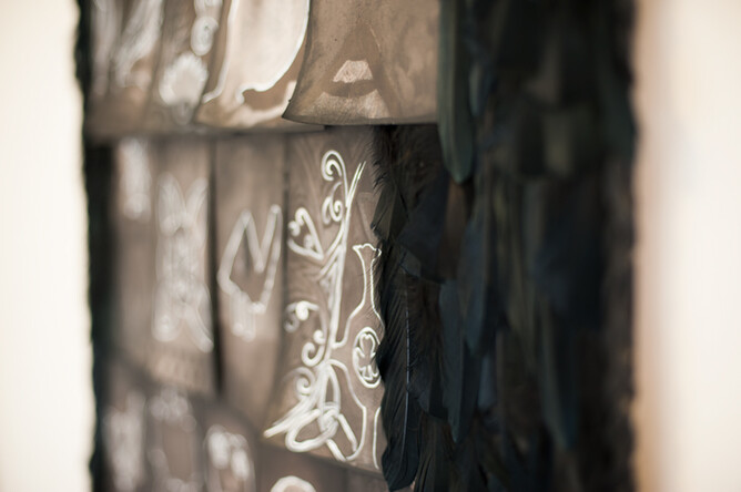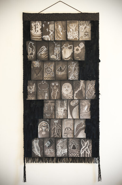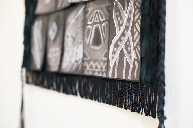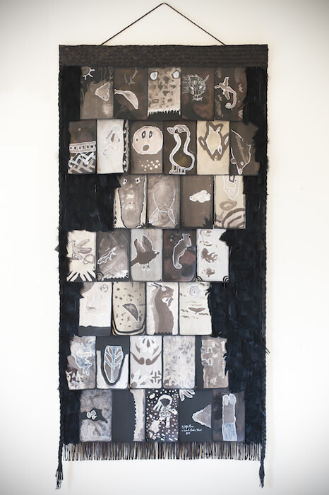 The individual canvases were painted by the children and then joined together like feathers in a cloak. I then used other materials like plaited rope, black feathers and woven flax to finish the works off. I think these artworks remind us of pacific tapa cloth, korowai or traditional maori cloaks and woven mats.