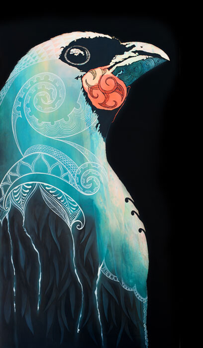 Seeing as the creative process for this painting took place in Nelson, the triangular patterns on top of the bird's head could be interpreted as a map of the junction of our north and south islands.