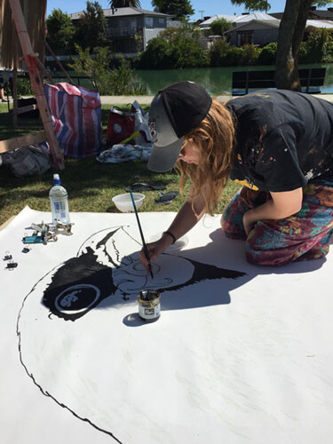 A huge pat on the back to the practical, artistic, surfy genius that is Geoff Noble who not only painted a masterpiece during the festival but also made all those huge, sturdy easels that you can see in the pictures. And also a big thank you to our sponsors Liquitex for the paints, Nelson City Council and Red Gallery for currently exhibiting our finished works.