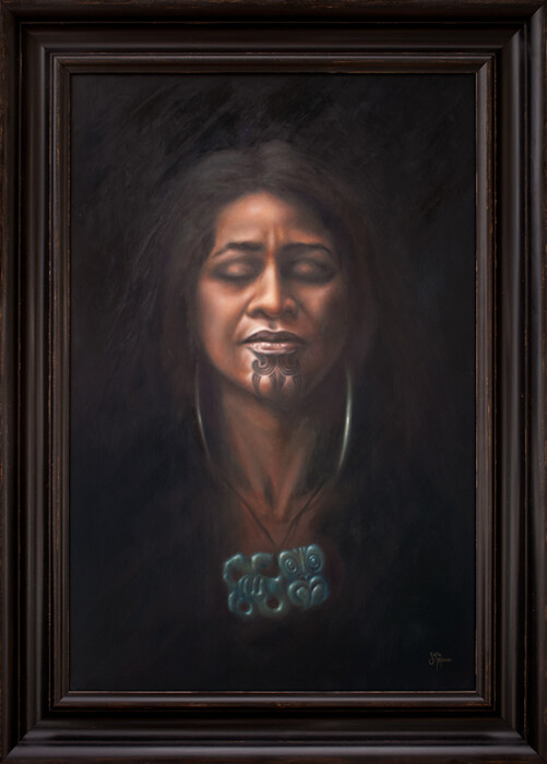The first piece "Mana Wahine" (pictured left) is a framed oil portrait, which celebrates the strength and endurance of Maori women. The other four pieces are highly detailed acrylic paintings from Minson's native New Zealand bird series.