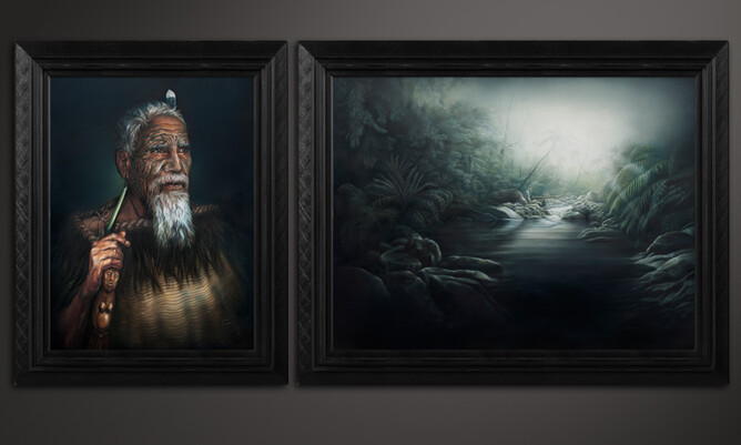 Three years in the making, this two piece oil work consists of a very traditional looking portrait of an old Maori man with a full face moko (tattoo) set alongside a mystical New Zealand forest landscape painting with a stream and glowing light.