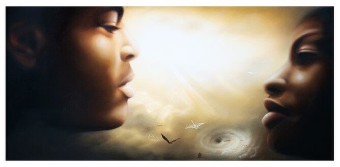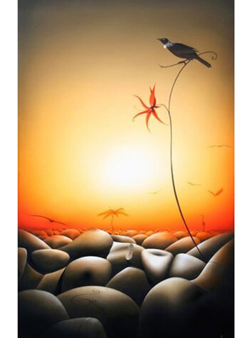 I present a similar theme in Dawn of Aotearoa, using a surreal landscape to represent the way our world emerged and it was able to sustain life - plants, animals and ultimately humans. Papatūānuku nude form lies within the river stones that bathe in the caressing glow of Ranginui.