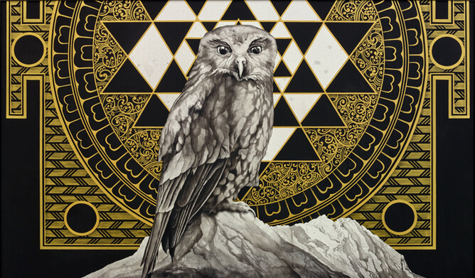 The Sri Yantra encompasses the space above and behind the Ruru. An ancient geometric emblem, the gilded Sri Yantra spreads across the canvas, its hypnotic geometry contrasts the softer natural form of the owl’s body.
