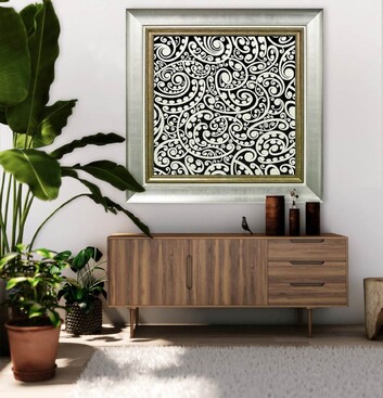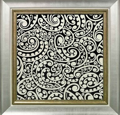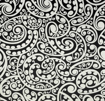 Koru is an organic pattern spiralling out from Te Pō, the Long Night. Represented in the black background, Te Pō is the fertile darkness from which Te Ao Mārama, the World of Light, is born into existence. The koru designs, painted with a metallic pearl luster, branch off from one another and spiral on infinitely.