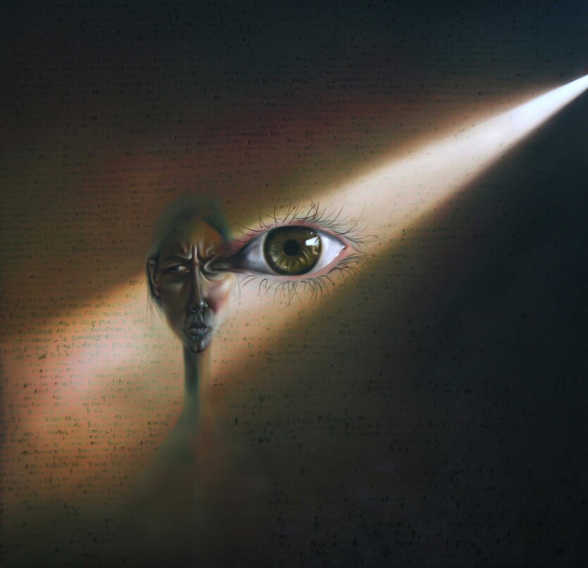 The portrait is the unconscious self, inundated with images, words and broken ideas. The enlarged eye symbolizes our ability to observe or listen to the expected noise of the mind and thereby become extremely present, awaiting its arrival. In 'watching' or 'waiting' one actually creates space and connects to a higher level of consciousness.