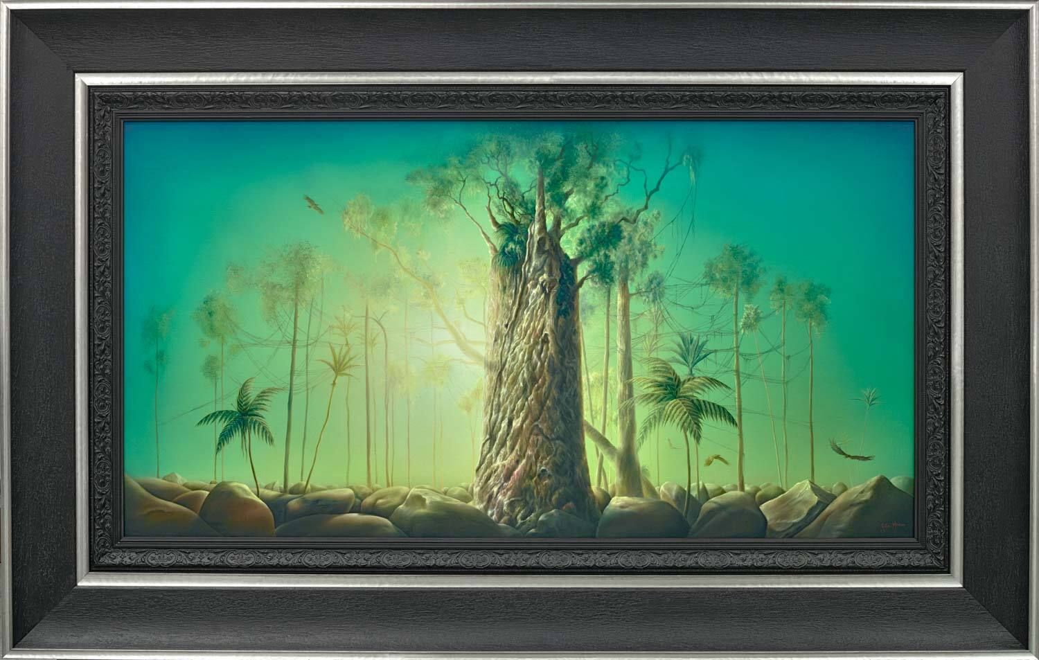 God of the forest and progenitor of mankind Tāne Mahuta, in the form of a giant, gnarled old kauri tree, rises from a surreal riverbed of boulders along with other elongated kauri, ponga ferns and nikau palms. Pouakai eagles - a native bird with the world's largest wingspan of over 3 metres that went extinct c.1400 A.D. - soar through the forest acting as guardians. The prehistoric New Zealand forest is bathed in the first glow of Te Aō Mārama or The World of Light, which in Māori creationary tradition came into being after Tāne separated earth and sky.