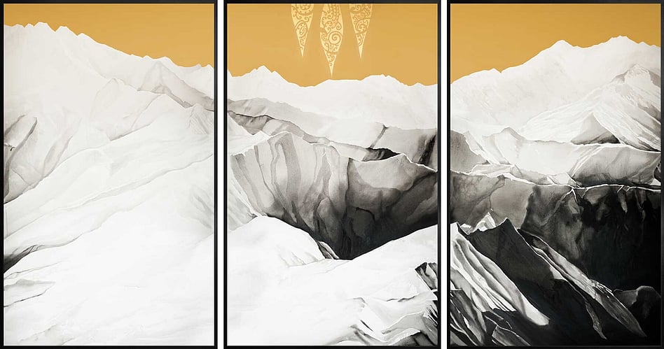 When you stand in front of this 3 metre wide painting, its immense scale makes you feel like you're on a precipice. You become part of the landscape. You look out towards the snow covered mountains of Tiritiri-o-te-Moana (Southern Alps).