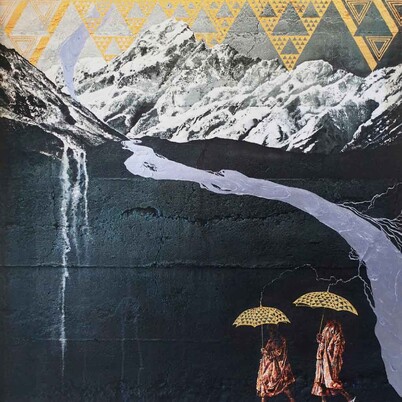 This artwork encapsulates the essence of Waiora, representing spiritual wellbeing, purity, and connection through its dynamic balance of stillness and motion, inviting the viewer to reflect upon their personal journey and ancestral roots. Gentle saffron-robed monks appear serenely along the riverbank, symbolising the quiet human quest for deeper understanding and spiritual connection.